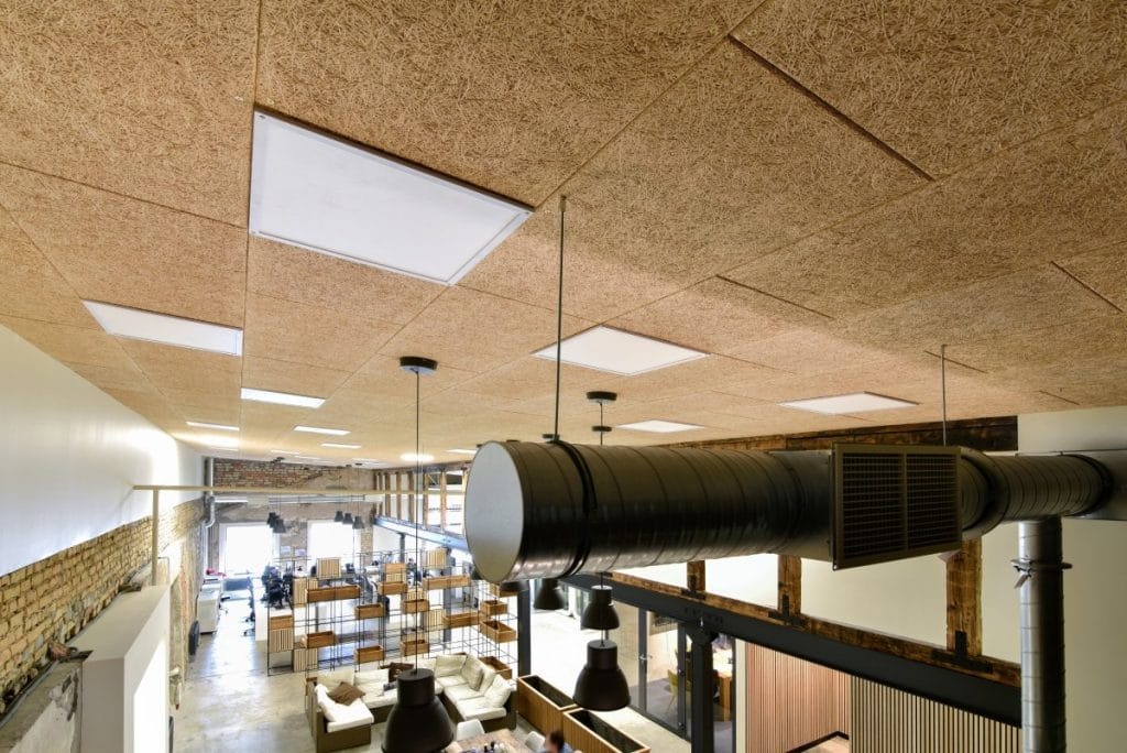 Need better sound / eco‑friendly / sustainableAcoustic / wood‑wool / recycled‑material ceiling