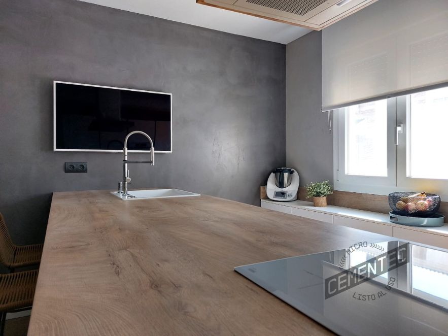 A New York loft transformed its living room wall by applying light micro‑cement over the fireplace feature, then adding vertical wood slats on the lower half. The result: raw, urban sophistication softened by natural wood warmth. The matte cement balances nicely with warm-toned furnishings and neutral upholstery.