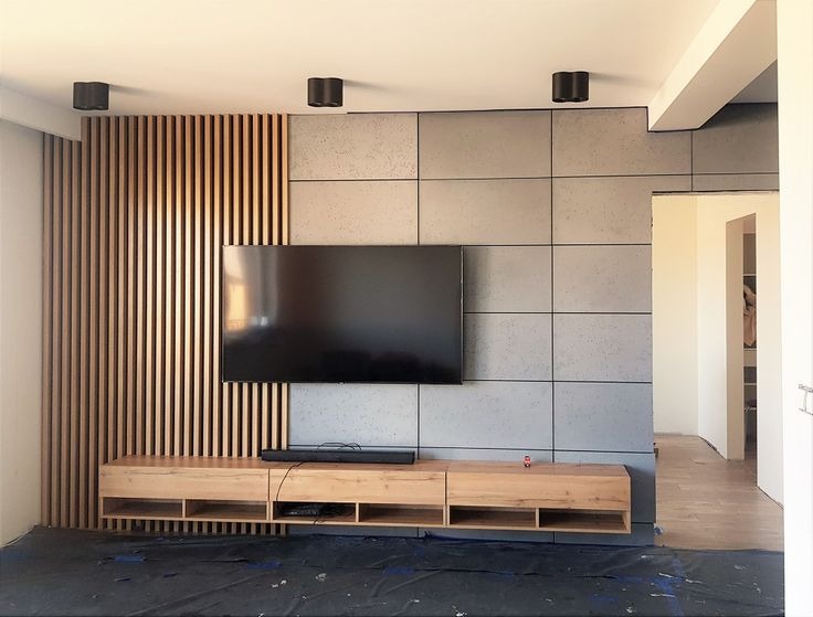 Example A – Urban Loft Living Room (Concrete + Wood Slat Combo)